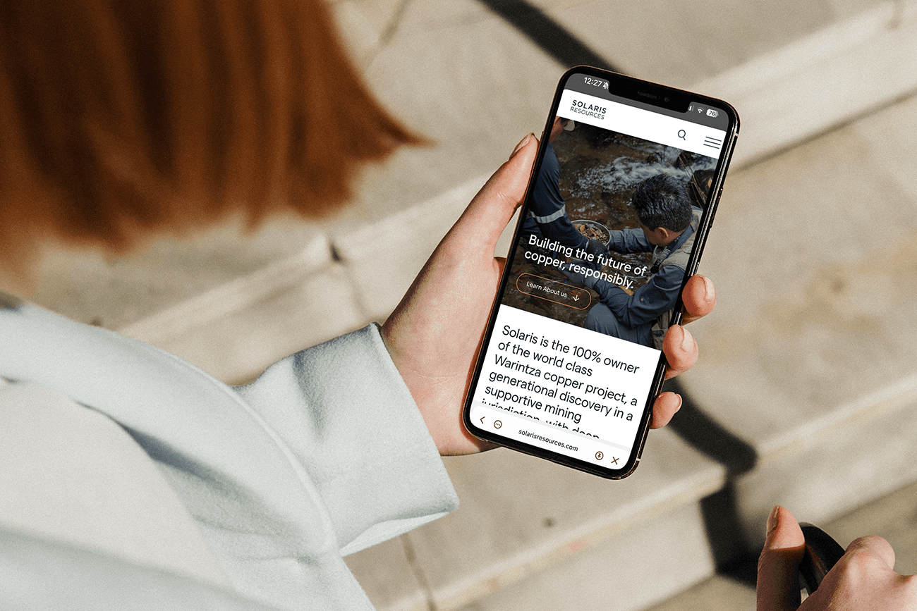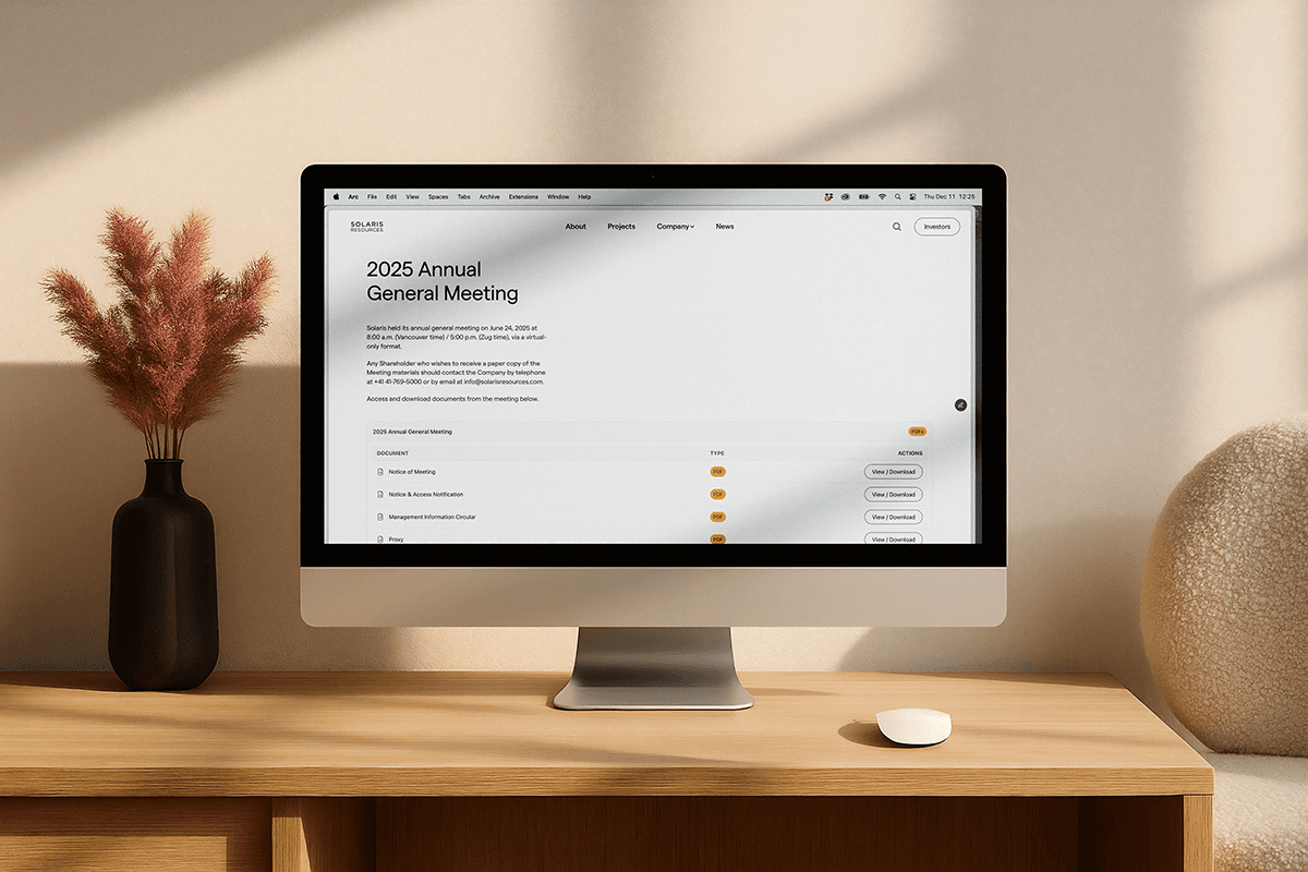 Solaris Resources asked Cathedral to rethink its digital presence from the ground up. We rebuilt the information architecture into a clear, two-track experience: a data-rich pathway for investors and a narrative-led pathway for general visitors. The site was rebuilt on Framer with Dropbox used as the central source for all technical and disclosure documents, simplifying ongoing document management.